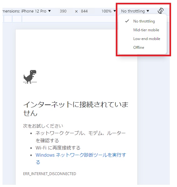 chrome デベロッパーツールを使うとネットに繋がっていないとなる