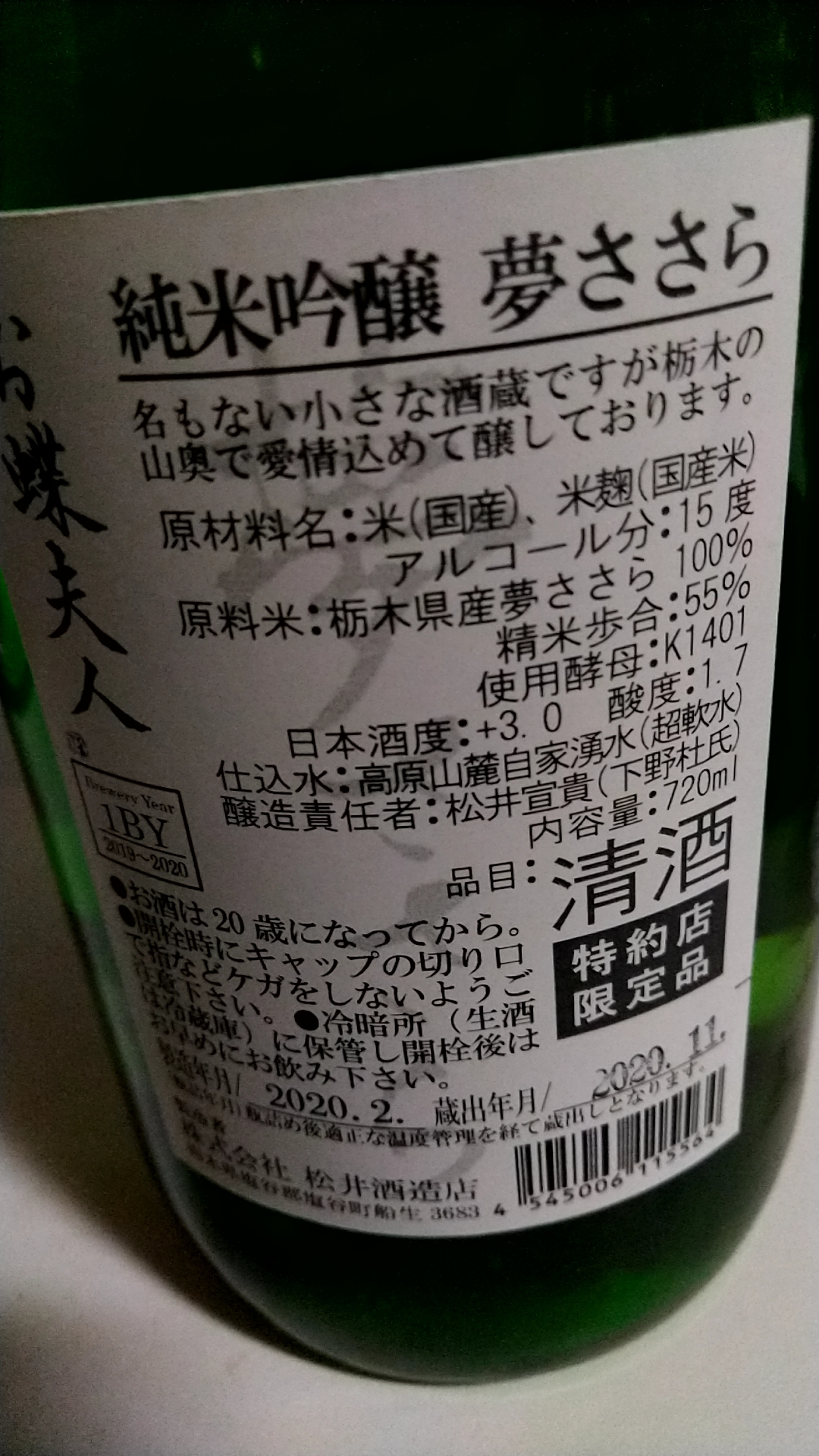 栃木の松井酒造さんとこの「お蝶夫人 純米吟醸 夢ささら」。